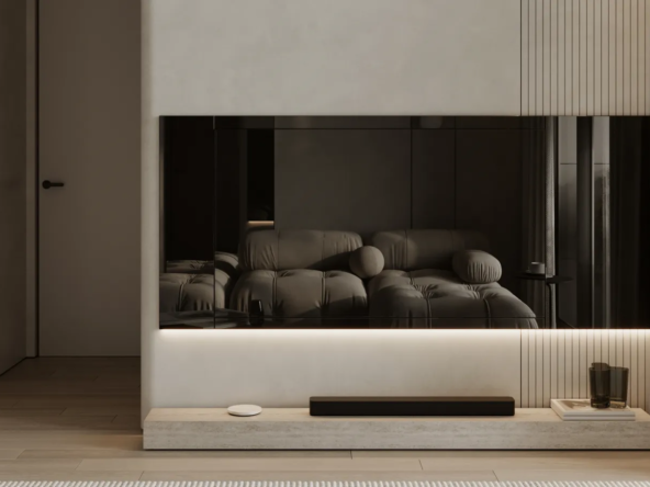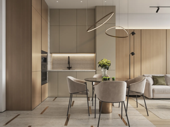 The interior design is based in part on minimalistic style, characterized by clean lines and the aesthetics of free space. Bright elements combined with a neutral color palette create a vibrant and welcoming atmosphere. Simple geometric shapes and lines in the design add elegance to the interior.
